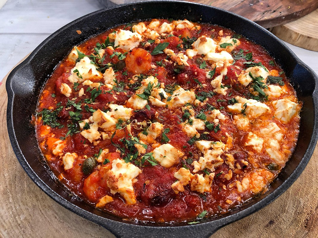 Garides saganaki is one of the most loved Greek dishes — shrimp in a light tomato sauce finished with feta.